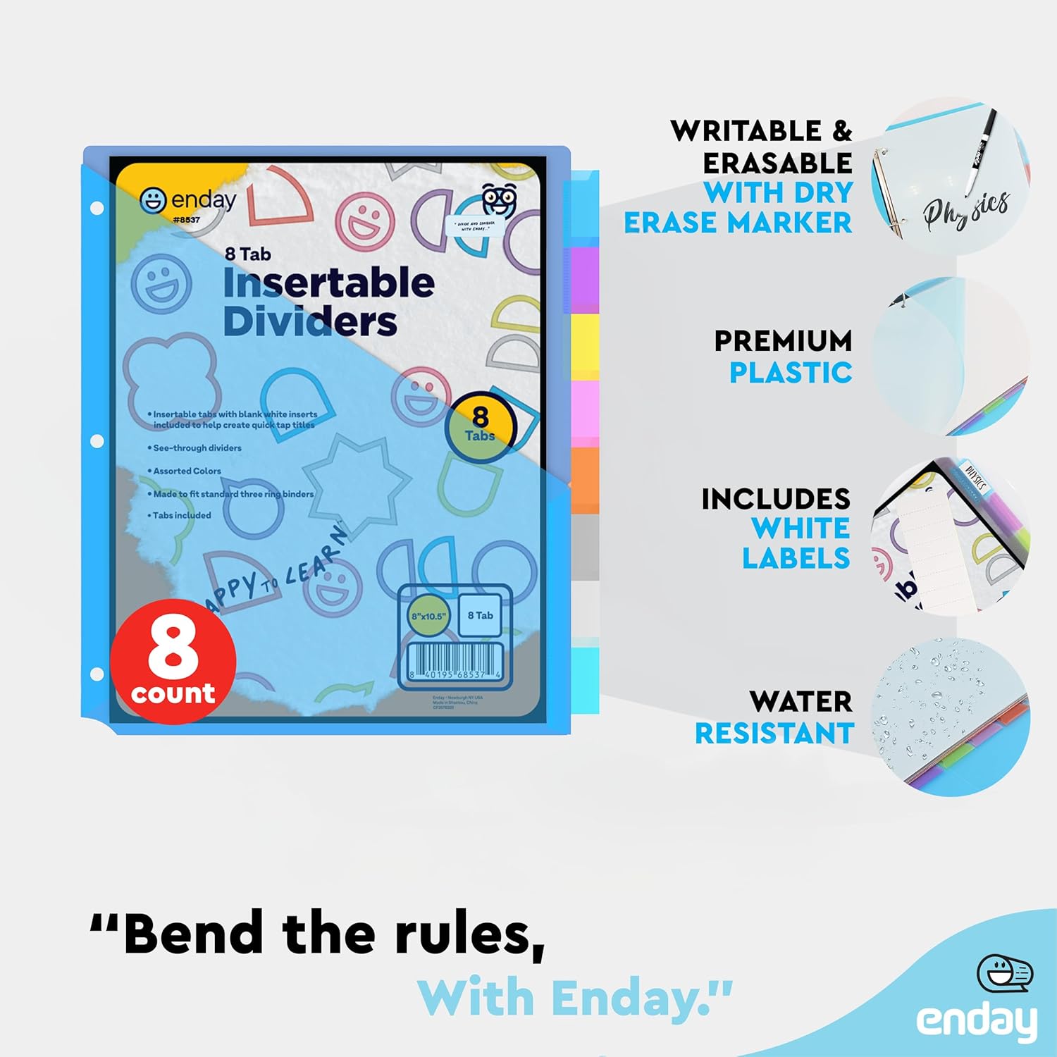 The Educated Choice Make the decision that will bring you satisfaction when you choose Enday products. These folder dividers with tabs are transparent so that you will have an easy time reading the papers inside. The 3 ring dividers with tabs comes in a 8 pack substantial enough to clearly organize the material for a business project and school report.